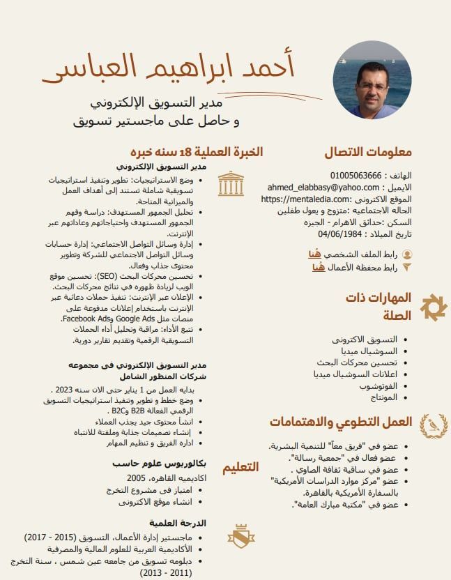 مدير تسويق الكتروني بخبرة تمتد لسنوات طويلة في اعداد وتنفيذ الاستراتيجيات التسويقية باحترافية عالية، وتحقيق نمو فعلي في المبيعات وبناء العلامات التجارية. ابحث عن فرصة داخل شركة كبرى أستطيع من خلالها توظيف خبرتي بكفاءة ودقة لتحقيق أهدافها التسويقية وتعزيز حضورها الرقمي بأفضل النتائج