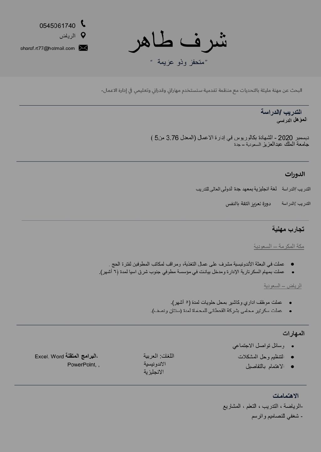 اسمي شرف أمر الله طاهر الجنسية اندونيسي العمر 27 الوظيفة السابقة سكرتير محامي لمدة سنتين ونصف الإقامة الحالية مدينة الرياض متخرج من جامعة الملك عبدالعزيز بكالوريوس إدارة أعمال