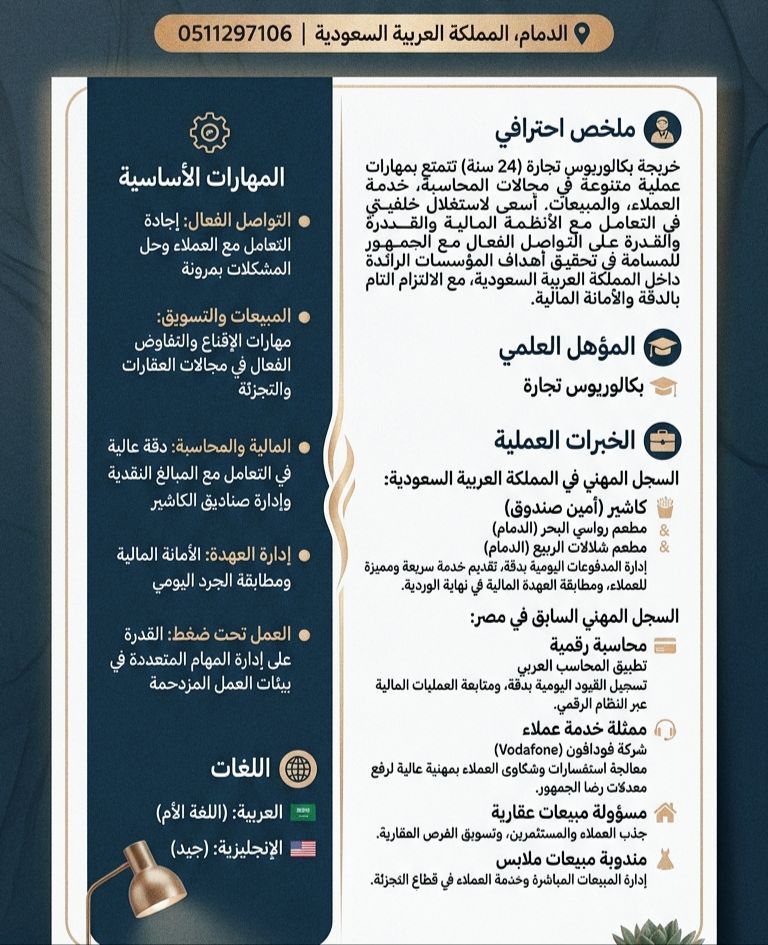 أنا بنت خريجه بكالوريوس تجارة متواجده في الدمام ولكن مستعدة للانتقال في أي مدينة أخرى بدور ع فرصة عمل بنقل كفالة محاسبه أو سكرتيرة أو استقبال أو كاشيره أو خدمة عملاء وتسويق فضلا اللي قدامه أي فرصه يساعدني يتواصل بي