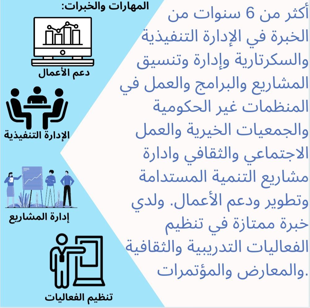 I am looking for a job in the Riyadh region. I have over seven years of experience in office management, executive secretarial work, project management, and business support. I also have excellent experience in organizing various types of events, including training workshops, festivals, cultural events, exhibitions, and conferences