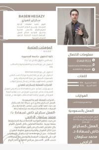 أنا باسم محمود حجازي. 30 سنة. عملت كسكرتير تنفيذي بشركتي ريفي وتساهيل لتمويل المشروعات في القاهرة ثم العمل كسكرتير واداري بشركة صاد للاستثمار. وكسكرتير خاص لسعادة / د محمد سليمان الراجحي. خبرة بمجال الإدارة والسكرتارية وادخال وتحليل البيانات. امتلك مهارات التواصل والخطابة ولغة E ممتازة تحدثا وكتابة وعلي معرفة بجميع برامج الأوفس خاصة word وexcel