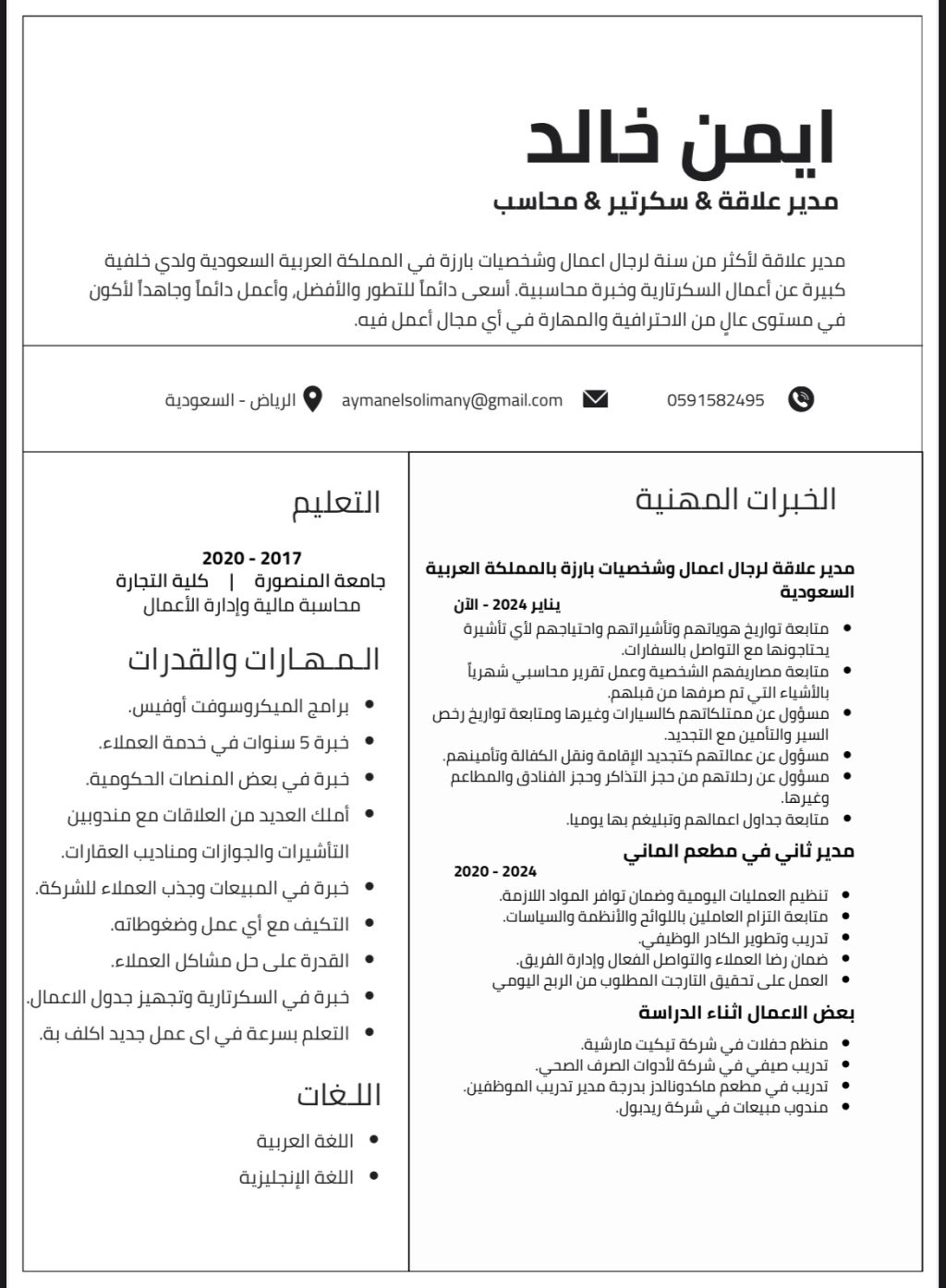 ابحث عن وظيفة (مدير علاقة - سكرتير - محاسب) السن 26 امتلك إقامة سنة ورخصة قيادة 5 سنوات مقيم في الرياض وقابل للتنقل لدي خبرة جيدة في السعودية لأكثر من سنة ونصف والخبرات موجودة في أل CV