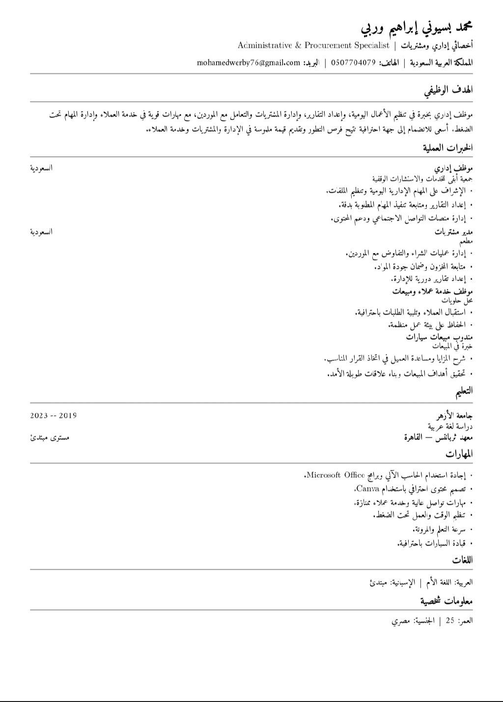 أخصائي اداري ومشتريات بخبرة في تنظيم الأعمال اليومية، اعداد التقارير، إدارة المشتريات والتعامل مع الموردين، بالاضافة الى خبرة في خدمة العملاء والمبيعات. أجيد استخدام برامج Microsoft Office وتصميم المحتوى عبر Canva، مع مهارات قوية في التواصل والعمل تحت الضغط. متاح للعمل فورا داخل المملكة العربية السعودية. للتواصل