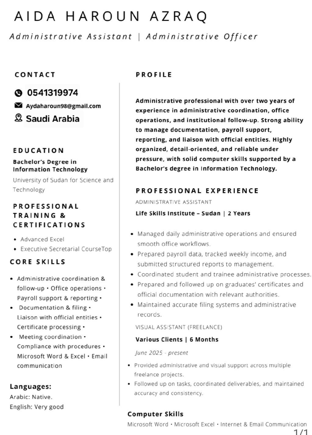 A skilled secretary with 2 years of experience, highly proficient in Microsoft Office (Word, Excel) and equipped with basic data analysis skills to support better organization and decision - making. Detail - oriented, efficient, and focused on making workflows smoother and more productive. Currently in Saudi Arabia (visit visa) and ready to start immediately. CV attached