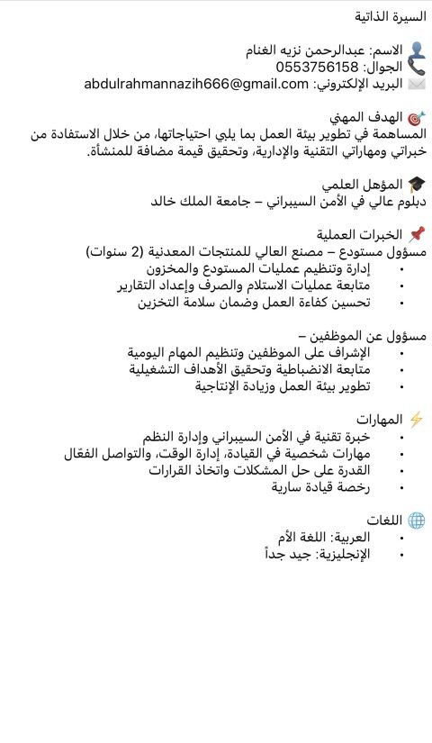 سكرتير تنفيذي ومنسق اداري ومدخل بيانات ومراقب جودة وخبرة بأعمال السكرتارية وتنظيم المواعيد والمراسلات والتواصل مع أعضاء الشركة وخبرة في الكمبيوتر وبرامج الأوفيس ورد واكسل وبوربوينت والعمل على الأنظمة الماليه والاداريه وخبرة في المشتريات والجودة حاصل على ماجستير وخبرة عشر سنوات في المجالات الاداريه ويمني الجنسية مقيم حاليا في الرياض ومتاح للعمل في أي مدينة وحاصل على رخصة سواقة سارية والإقامة سارية