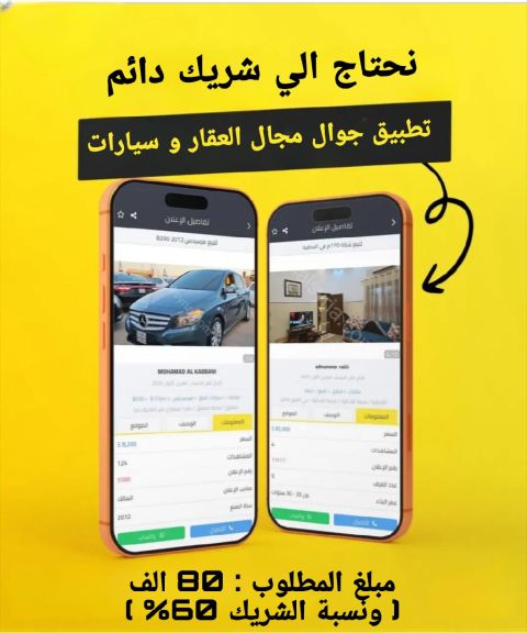لدي فكرة مشروع عبارة عن تطبيق جوال مختص في مجال العقارات ولسيارات تم تطوير الفكرة الى شكل مطور، وتم اضافة أفكار تنافسيه، المشروع قيد التصميم منبقي 5 في مائة، ونحتاج الآن الى شريك دائم، المبلغ المطلوب 80 ألف ونسبة الشريك 60 في مائة نحن فريق مكون من ثلاثه أشخاص ونعمل في شركة مجال تقنية المعلومات قسم الادارة وتطوير وتشغيل، باقي التفاصيل عند التواصل واتساب علما أن مكتبنا في الرياض