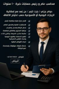 محاسب عام محترف متاح دوام جزئي / بارت تايم / عن بعد مع امكانية الزيارات اليومية أو الأسبوعية حسب احتياج الاتفاق أقدم إدارة مالية متكاملة تشمل ادخال الزكاة والدخل والضرائب الاستشارات المالية والتحليل المالي مراقبة المخزون والكاشير لمطعمك متابعة مناديب المبيعات وتقارير الأداء تنظيم الحسابات والقيود اليومية واعداد التقارير الاحترافي اعداد القوائم المالية خدمة دقيقة، موثوقة، وتساعدك نمو شركتك الرياض