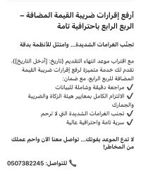 ارفع اقرارات ضريبة القيمة المضافة - الربع الرابع باحترافية تامة تجنب الغرامات الشديدة وامتثل للأنظمة بدقة مع اقتراب موعد انتهاء التقديم نقدم لك خدمة متميزة لرفع اقرارات ضريبة القيمة المضافة للربع الرابع، مع ضمان مراجعة دقيقة وشاملة للبيانات الالتزام الكامل بمعايير هيئة الزكاة والضريبة تجنب الغرامات الشديدة التي لا ترحم لا تدع الموعد يفوتك تواصل معنا الآن