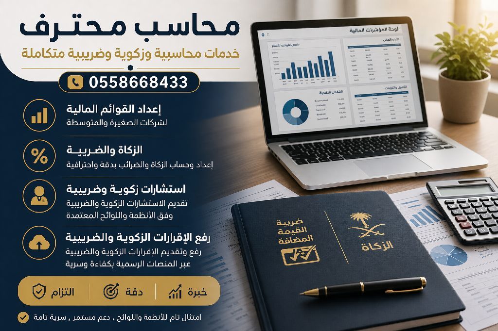 محاسب محترف متخصص في اعداد القوائم المالية للشركات الصغيرة والمتوسطة، مع خبرة متقدمة في الزكاة والضرائب، وتقديم الاستشارات الزكوية والضريبية وفق الأنظمة واللوائح المعتمدة، اضافة الى رفع وتقديم الاقرارات الزكوية والضريبية بكفاءة ودقة عالية، بما يضمن الامتثال الكامل وتحسين الأداء المالي