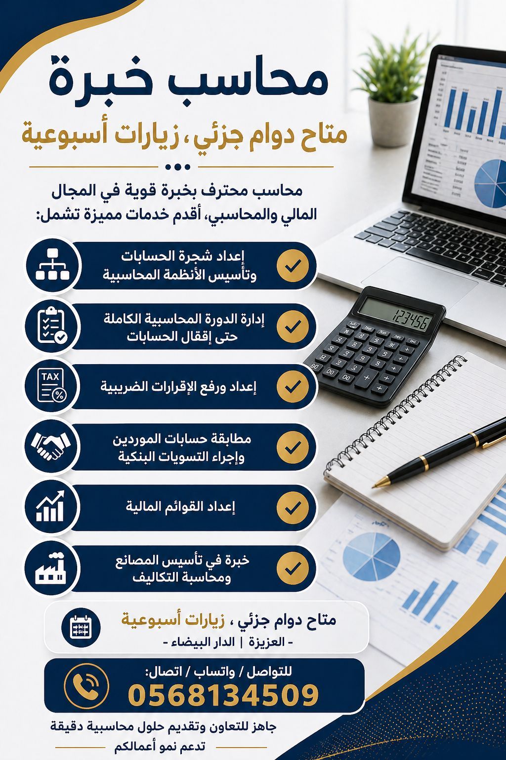 محاسب قوائم مالية وضريبة متاح دوام جزئي أسعار مناسبة تواصل معنا
