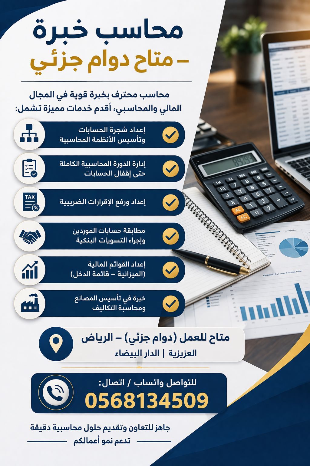 محاسب يمني الجنسية بدوام جزئي عن بعد، مسك سجلات الحسابات، اعداد التقارير الدورية، اصدار الفاتورة الكترونية متابعة حركة الصندوق والبنوك يوميا، رفع ت الضريبية، مطابقة أرصدة العملاء ين، اعداد القوائم المالية، أقفال أت الختامية