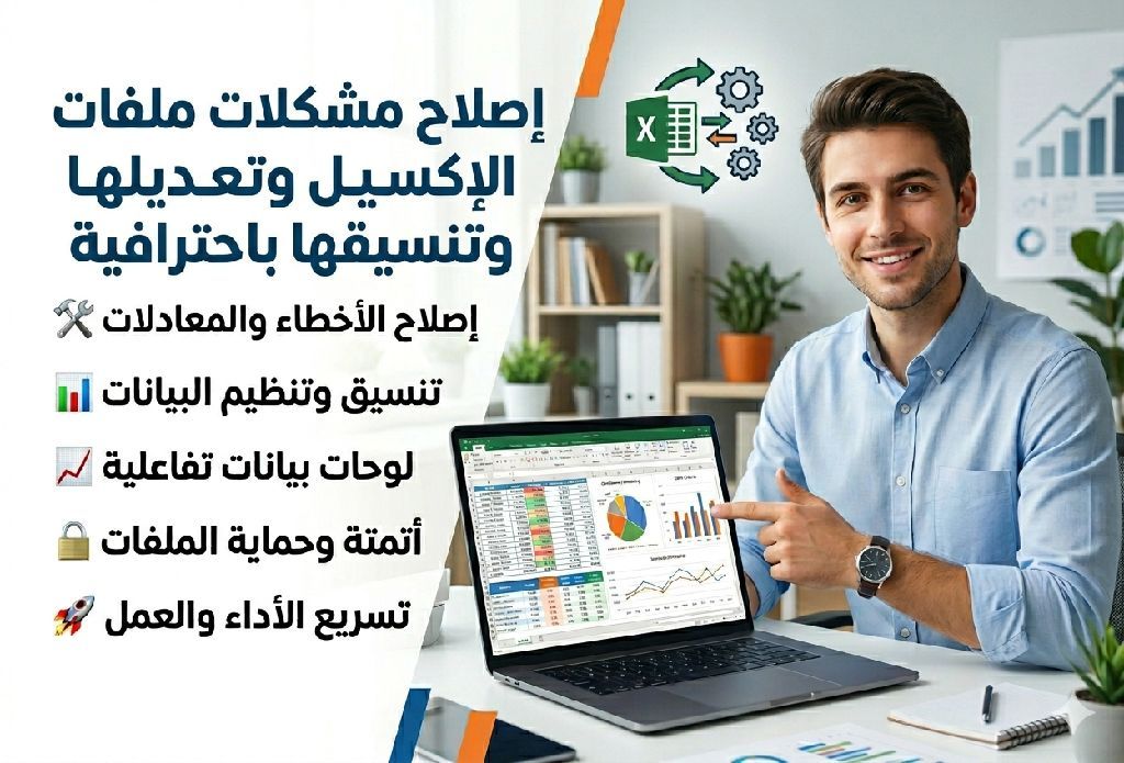 نقدم خدمة احترافية وشاملة لبرنامج Excel اصلاح مشكلات ملفات الأكسيل وتعديلها وتنسيقها باحترافية. تشمل الخدمة الاصلاح الفوري لكافة أخطاء المعادلات، التنسيق الشرطي والمحاسبي المتقدم لسهولة القراءة، ربط البيانات لاستخراج التقارير، وحماية الملفات. الحل الأمثل للمحاسبين، رواد الأعمال، والطلاب لضمان دقة التنظيم وسرعة الانجاز. وكل ما يخص الاكسل