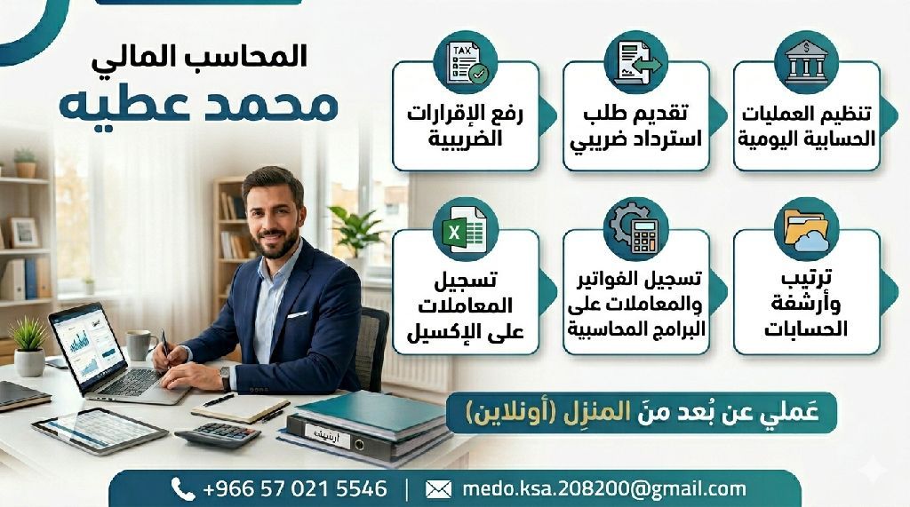 محاسبك المالي "اونلاين" دقة في الأرقام، أمان في الضرائب هل تبحث عن تنظيم مالي دقيق لمؤسستك أنا المحاسب محمد عطية، تخصصي هو ترتيب حساباتك من الألف الى الياء