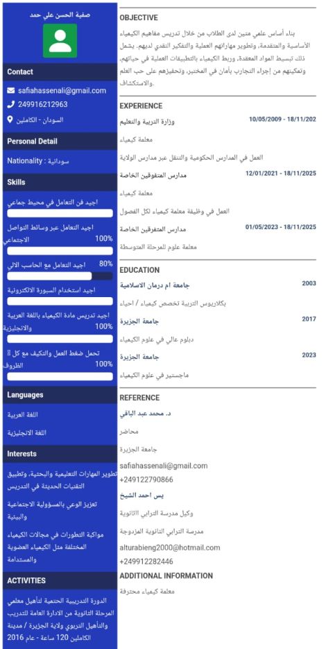 معلمة كيمياء جميع الفصول - ماجستير علوم كيمياء) خبرة في التعليم بالمدارس السودانية الحكومية والخاصة لمدة 16 عام متصلة. ترغب في العمل بالمملكة العربية السعودية. للتواصل رقم سعودي / رقم سوداني / ايميل