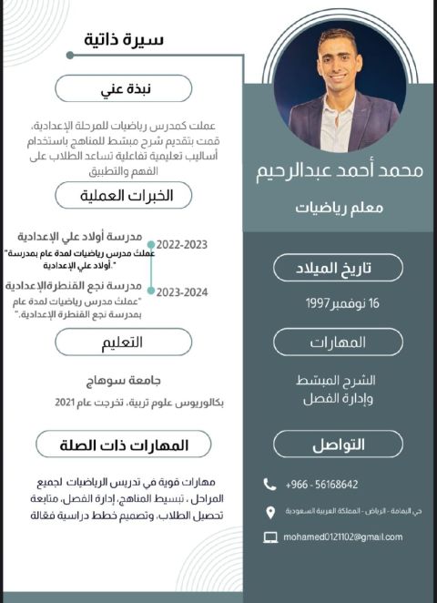 معلم صف إجازة بالتربية قسم معلم صف دبلوم أهلية التعليم الابتدائي خبرة 34 سنة بين التدريس والإدارة المدرسية متابعة الطلاب في كافة مرحلة التعليم الابتدائي ومرحلة التأسيس للصفوف الأولية تدريس مواد العلوم العامة والدراسات الاجتماعية واللغة العربية للمرحلة المتوسطة والثانوية وكذلك مادة علم النفس التربوي والدراسات الفلسفية للتواصل