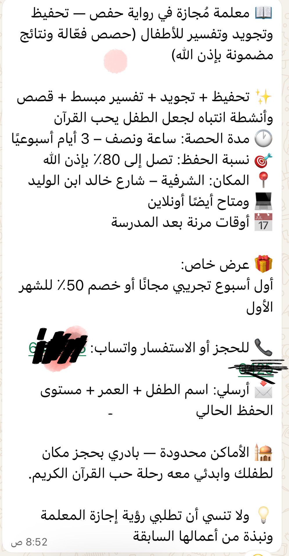 معلمة مجازة في رواية حفص تحفيظ وتجويد وتفسير للاطفال (حصص فعالة ونتائج مضمونة) تحفيظ + تجويد + تفسير مبسط + قصص وأنشطة انتباه لجعل الطفل يحب القرآن مدة الحصة ساعة ونصف - 3 أيام أسبوعيا نسبة الحفظ تصل الى 80 المكان الشرفية عرض خاص أول أسبوع تجريبي مجانا أو خصم 50 للشهر الأول. ولا تنسي أن تطلبي رؤية إجازة المعلمة ونبذة من أعمالها السابقة التواصل
