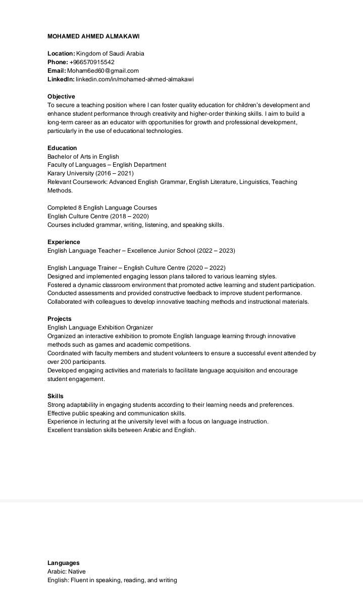 Bachelor’s degree holder in English Language, Sudanese nationality, seeking a position as an English teacher with the ability to deliver lessons using modern teaching methods that enhance students’ language skills and support educational goals