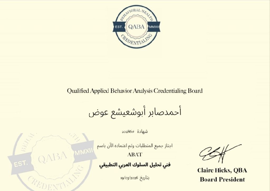 I am Ahmed Saber, a skills development specialist specializing in Autism Spectrum Disorder. I possess a blend of academic experience and international professional accreditation, holding the international ABAT certificate (American QABA Board) I have a postgraduate diploma (special and general) in Autism Spectrum Disorder from Zagazig University. My field experience includes mastery of ABA programs
