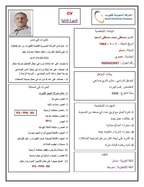 فني فحص وجوده محطات أرضيه وهوائية وميني بلر وRMU ومتابعة الشبكة الهوائية وعدادات ومشرف جميع أنواع الصيانة الكهربائية