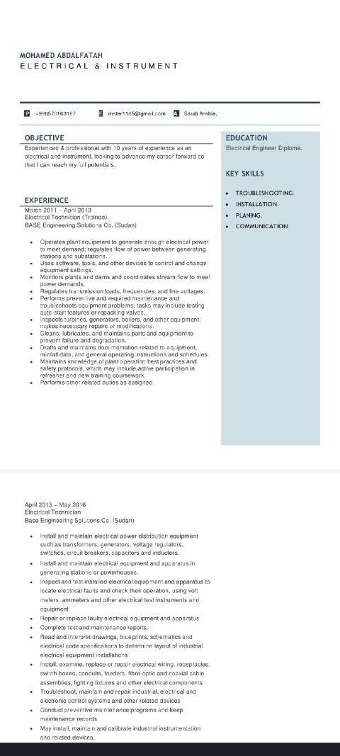 مراقب كهرباء Electrical inspector، خبرة علمية وعملية 15 سنة (مقاولات واستشارات هندسية) جهد متوسط وجهد منخفض دورات تدريبية في توزيع الكهرباء واجهزة القياس وصيانة الخط الساخن ودورة في السلامة، ودورات أخرى، إقامة سارية وعضوية سارية