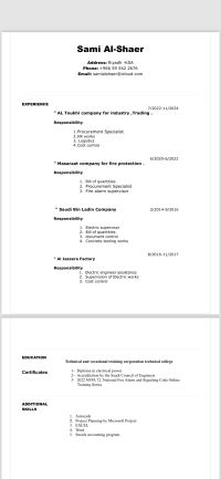 المهنة فني هندسة كهرباء معتمد في هيئة المهندسين وشهادة NFPA 72 الخبرة في شركة الأمن والسلامة للدفاع المدني - محطات الكهرباء شركة الطوخي مسؤول مشتريات المعرفة بالموردين والأسعار وصيانة المواقع والخدمات اللوجستية والعمل والمعرفة الجيدة على برامج مايكروسوفت والعمل في الموارد بشرية وادخال البيانات والمعرفة الجيدة في منصات العمل والحاسب الآلي