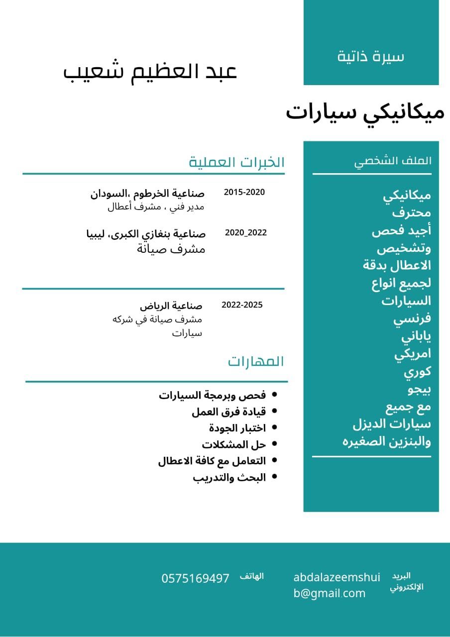 ميكانيكي سيارات ديزل وبنزين سوداني الجنسية، خبرة ممتازة واسعه جدا في مجال صيانة السيارات وبرمجة وفحص وادارة الورش والاشراف