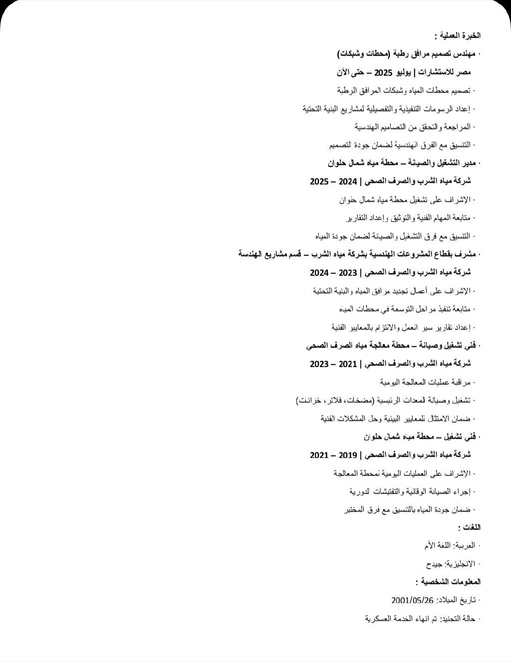 فني تشغيل وصيانة محطات وشبكات مياه الشرب والصرف الصحي / خريج المدرسة الثانوية لمياه الشرب والصرف الصحي / عملت فني تشغيل بمحطة مياه شمال حلوان سنة ونصف / ثم عملت بمحطات الصرف الصحي فني تشغيل لمدة سنتين / عملت بالمشروعات الهندسية لمدة عام بشركة مياه القاهرة حاليا مدير التشغيل والصيانة بمحطة مياه شمال حلوان / ذو كفاءة عالية في مجال التشغيل والصيانة لمحطات مياه الشرب والصرف الصحي حاليا مدير تشغيل محطة