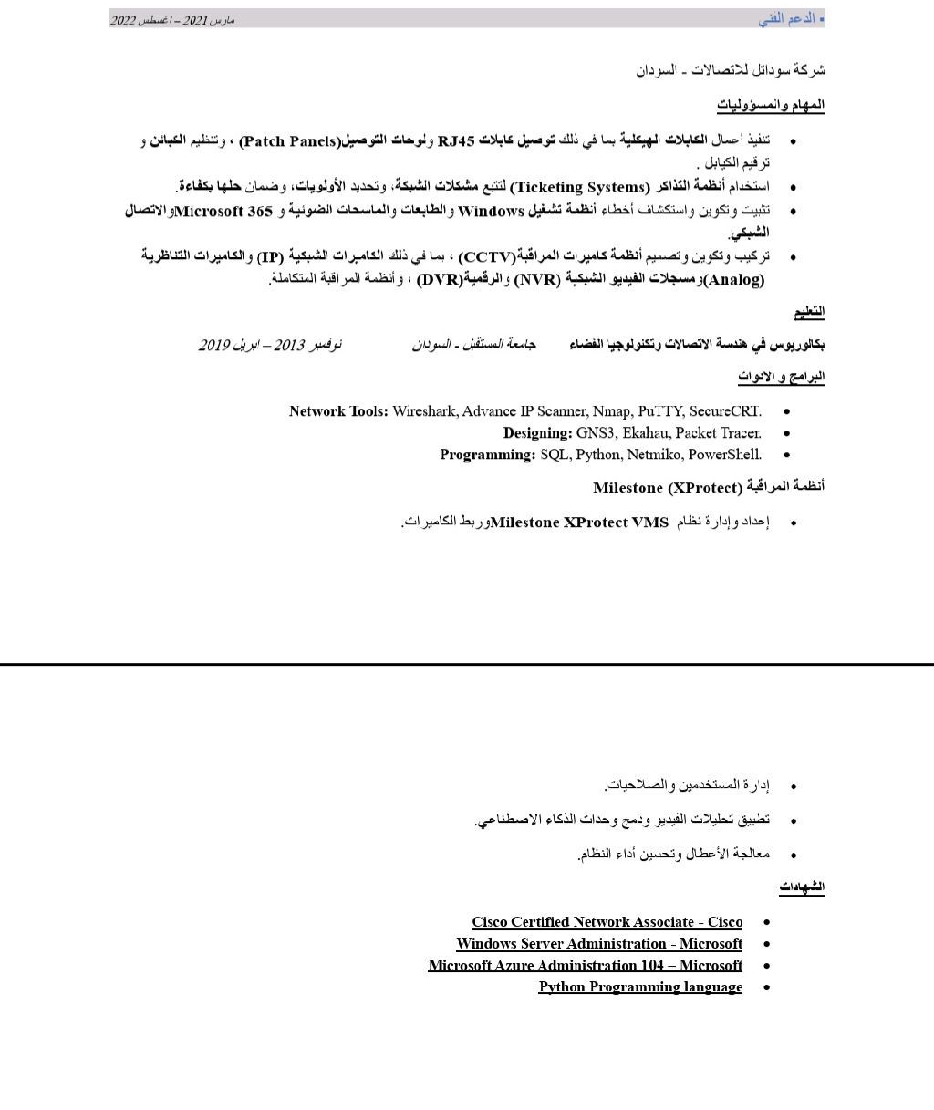 أحمد عبد السلام سوداني مواليد 1995 بكالوريوس هندسة الاتصالات والشبكات لدي 4 سنين خبرة في مجال الشبكات وتقنية المعلومات ومجال التيار المنخفض كاميرات المراقبة اكسس كنترول لواحات انذار الحريق برمجة اجهزة الشبكات سيسكو ريجي أوروبا راوترات سويتشات اكسس بوينت، برمجة اجهزة السنترالات جراند ستريم خبرة متوسطة في مجال erp system MS BC