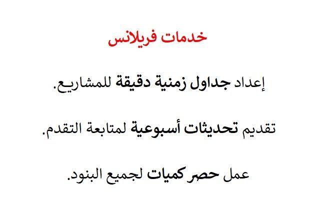 مكتبك الفني موجود من غير توظيف خدمات فري لانس للشركات والمقاولين عن بعد (حصر كميات دقيق ومنظم لجميع البنود الانشائية والمعمارية - عمل الجداول الزمنية للمشروعات المختلفة - متابعة وتحديث الجداول الزمنية - عمل التقارير اللازمة علي مدار المشروع - أي أعمال تخص المكتب الفني) التزام كامل بالمواعيد خبرة في التعامل مع المشاريع المختلفة وفر وقتك ومجهودك، وخليني أساعدك تنجز شغلك بأعلى كفاءة