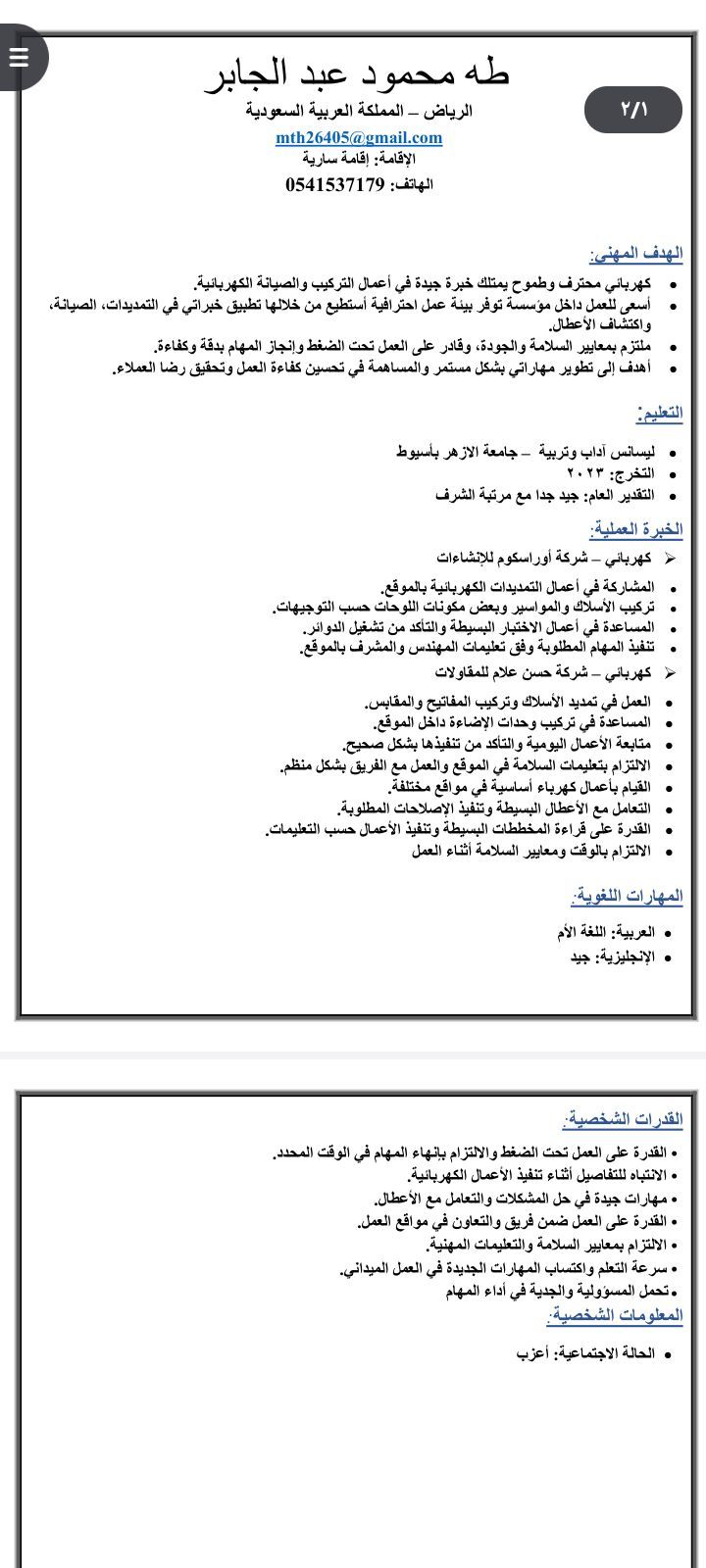 أنا كهربائي جيد وأريد العمل لدي بعض الشركات لتطوير مهاراتي وافادة المؤسسة بما أستطيع وبما لدي من خبرات ومهارات في مجال الكهرباء ولدي اقامة سارية