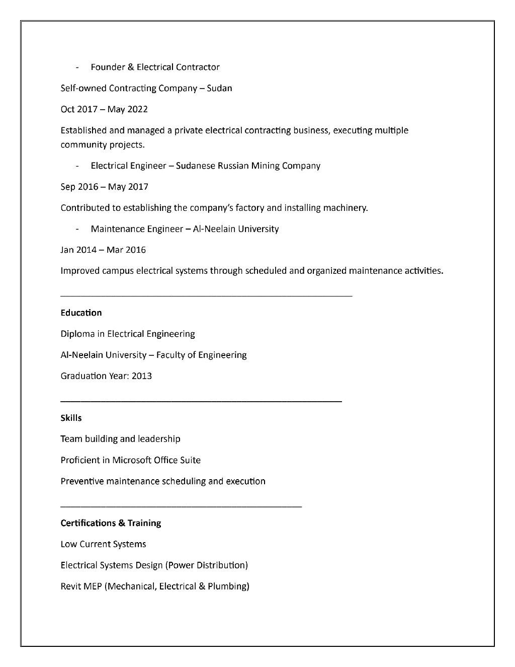 فورمان كهرباء حاصل على دبلوم في الهندسة الكهربائية من جامعة النيلين، شغوف بالتطوير المهني وتعزيز المعرفة التقنية. يتمتع بخبرة واسعة في الصيانة الكهربائية والإنشاءات والتركيبات والاشراف على المشاريع في مختلف القطاعات، بما في ذلك القطاع الأكاديمي، والتعدين، والإنشاءات، والاتصالات. يتمتع بمهارة في بناء وقيادة فرق عمل فعالة، وتسليم المشاريع في الوقت المحدد بجودة عالية