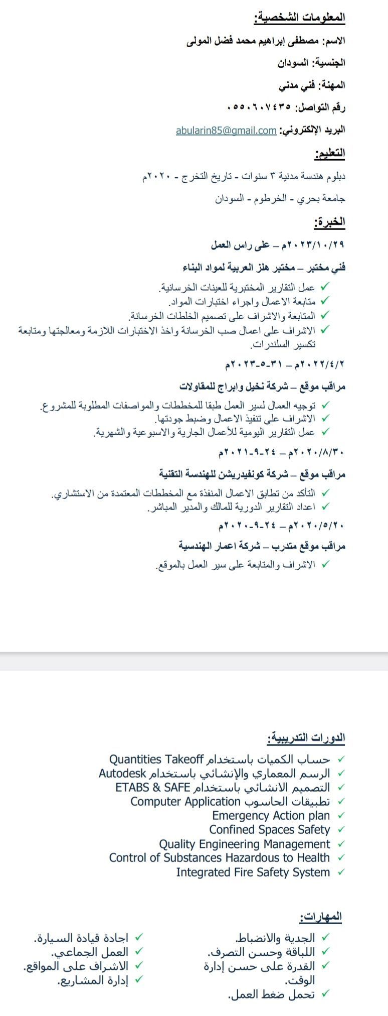 مراقب مدني سوداني مسجل لدي الهيئة السعودية للمهندسين، رخصة قيادة سارية ذو خبرة في الاشراف وإدارة المشاريع الانشائية، خبرة في اختبارات المواد وإدارة المواقع وسأكون اضافة حقيقة للجهة التي اعمل لصالحها، متاح للعمل في جميع أنحاء المملكة