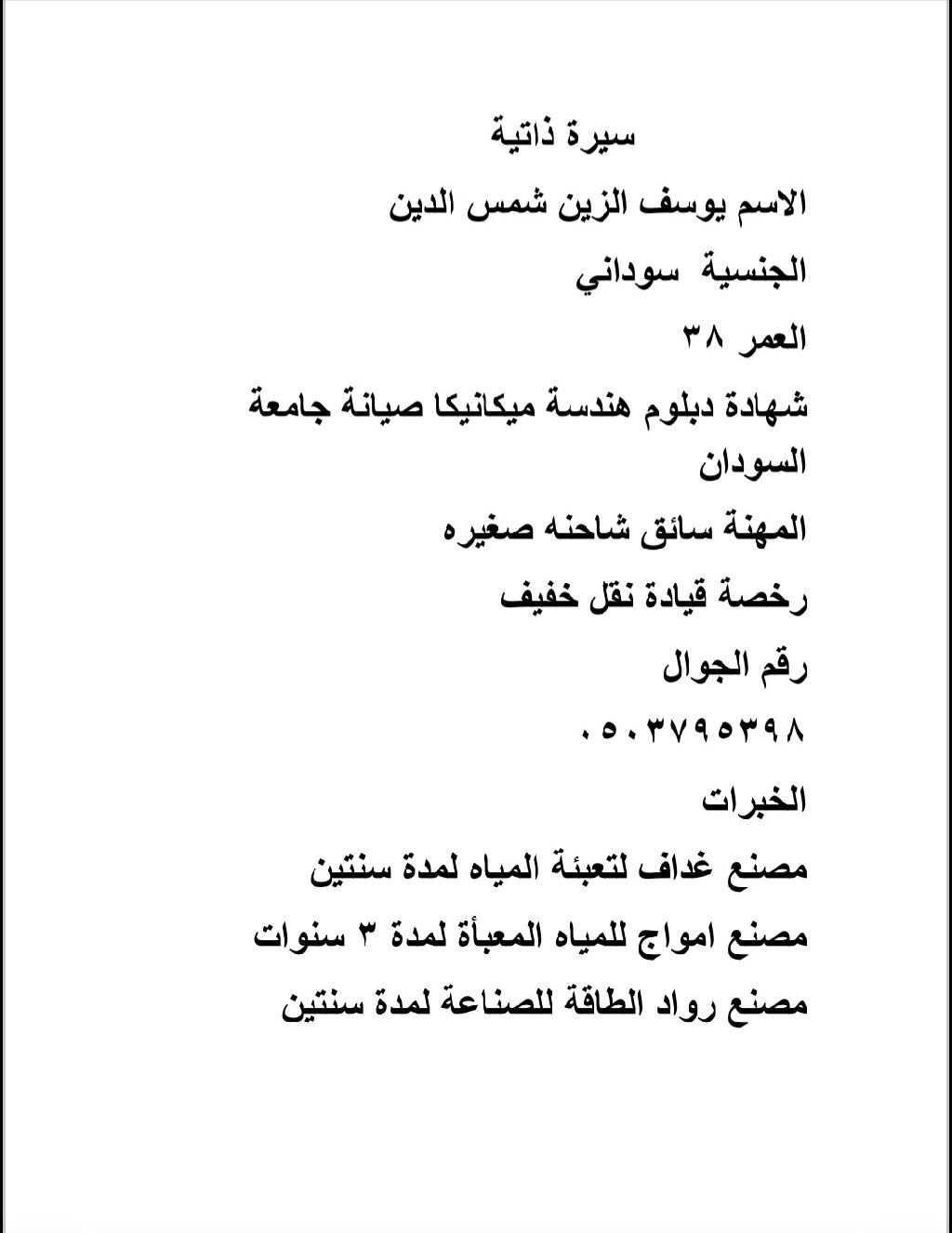 فني ميكانيكا صيانة سوداني الجنسية إقامة بمهنة سائق شاحنة صغيرة ورخصة قيادة نقل خفيف خبرة 8 سنوات في المملكة في مجال مصانع المياه المعبأة وسنتين في مصنع تعبئة الزيوت