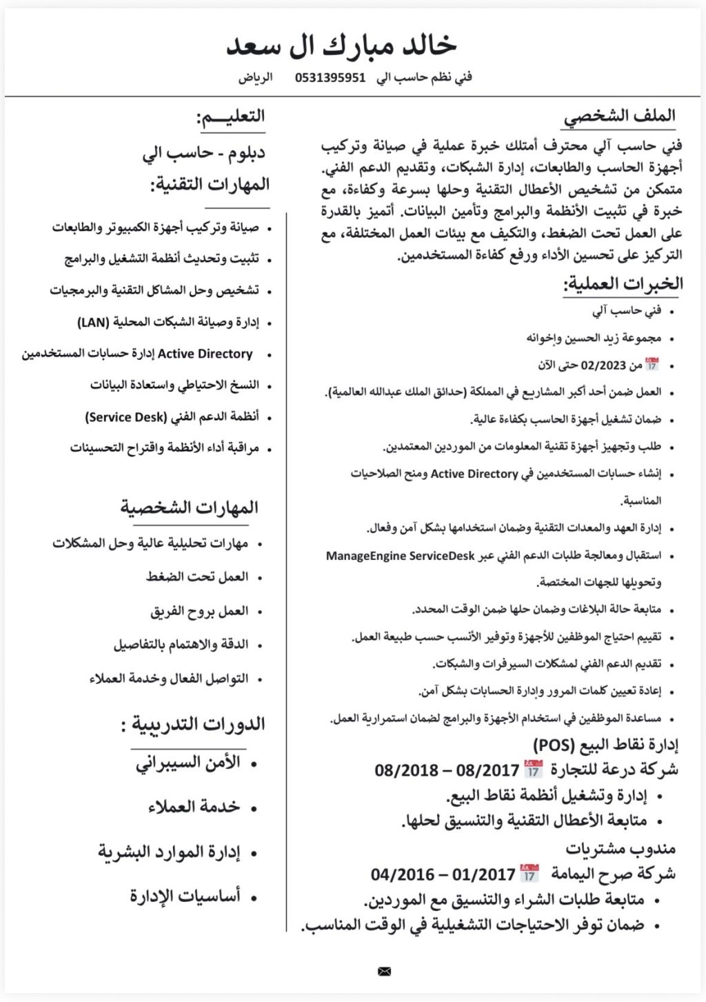 فني حاسب آلي محترف امتلك خبرة عملية في صيانة وتركيب اجهزة الحاسب والطابعات، إدارة الشبكات، وتقديم الدعم الفني. متمكن من تشخيص الأعطال التقنية وحلها بسرعة وكفاءة، مع خبرة في تثبيت الأنظمة والبرامج وتأمين البيانات. أتميز بالقدرة على العمل تحت الضغط، والتكيف مع بيئات العمل المختلفة، مع التركيز على تحسين الأداء ورفع كفاءة المستخدمين