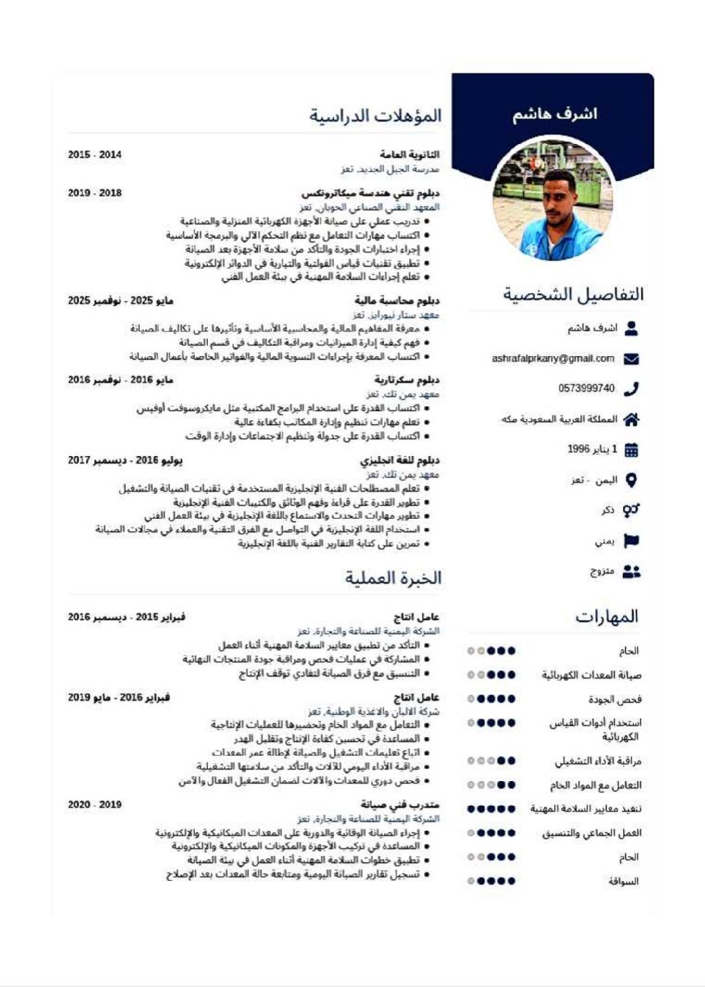 أنا ابحث عن عمل في شركة صناعية لدي خبرة في هذا المجال اشتغلت عامل انتاج ومشغل الألات وفني صيانة ولدي القدرة على القراءة الكتالوجات الخاصة بالألات والتعامل مع الاجهزة الالكترونية امتلك من الشهادات دبلوم هندسة ميكاترونكس دبلوم سكرتارية وأيضا دبلوم انجليزي ودبلوم المحاسبة المالية