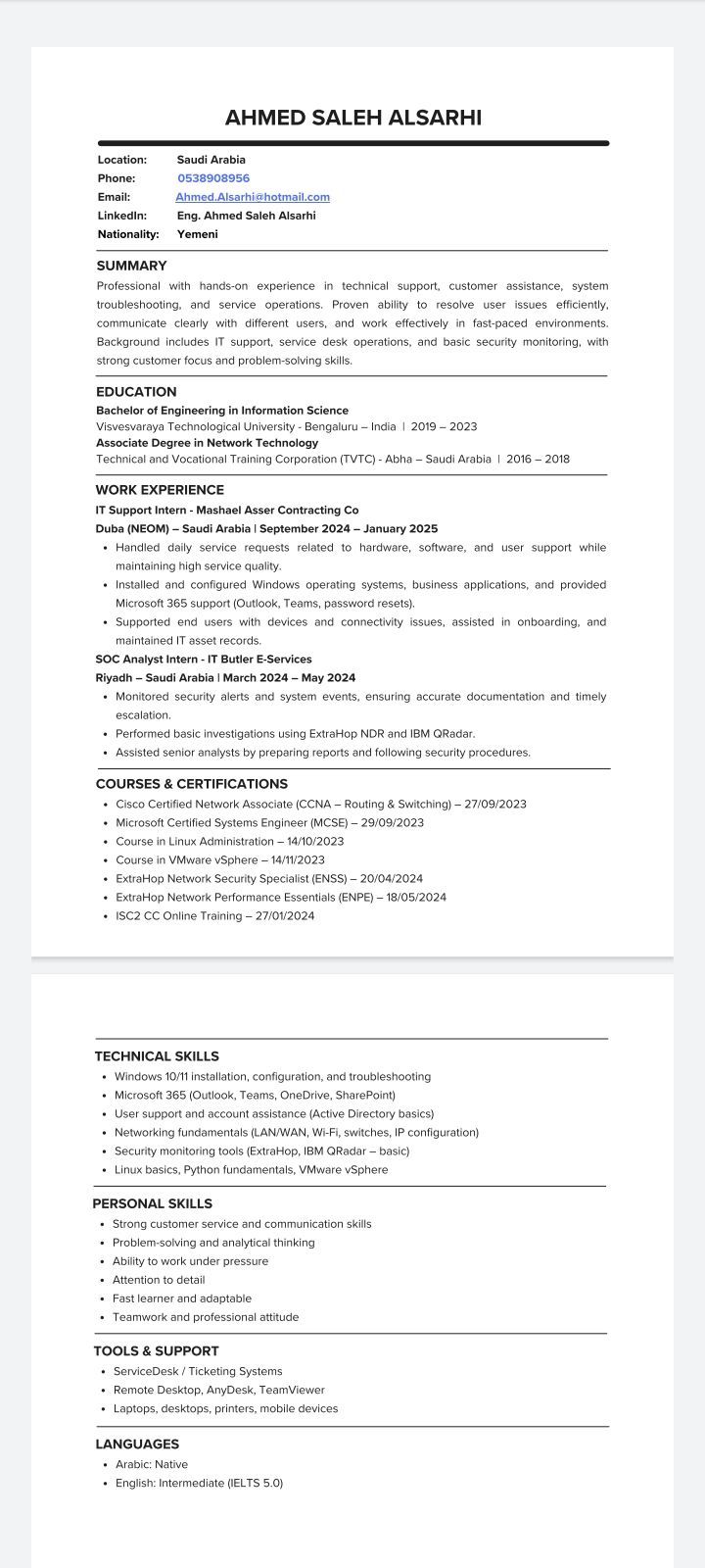 محترف أتمتع بخبرة في الدعم الفني، ومساعدة العملاء، استكشاف أخطاء الأنظمة وإصلاحها، وعمليات الخدمة. امتلك قدرة مثبتة على حل مشكلات المستخدمين بكفاءة، والتواصل بوضوح مع مختلف المستخدمين، والعمل بفعالية في بيئات سريعة الوتيرة. تشمل خبرتي دعم تقنية المعلومات، وعمليات مكتب الخدمة (Service Desk) والمراقبة الأمنية الأساسية، مع تركيز قوي على خدمة العملاء ومهارات حل المشكلات