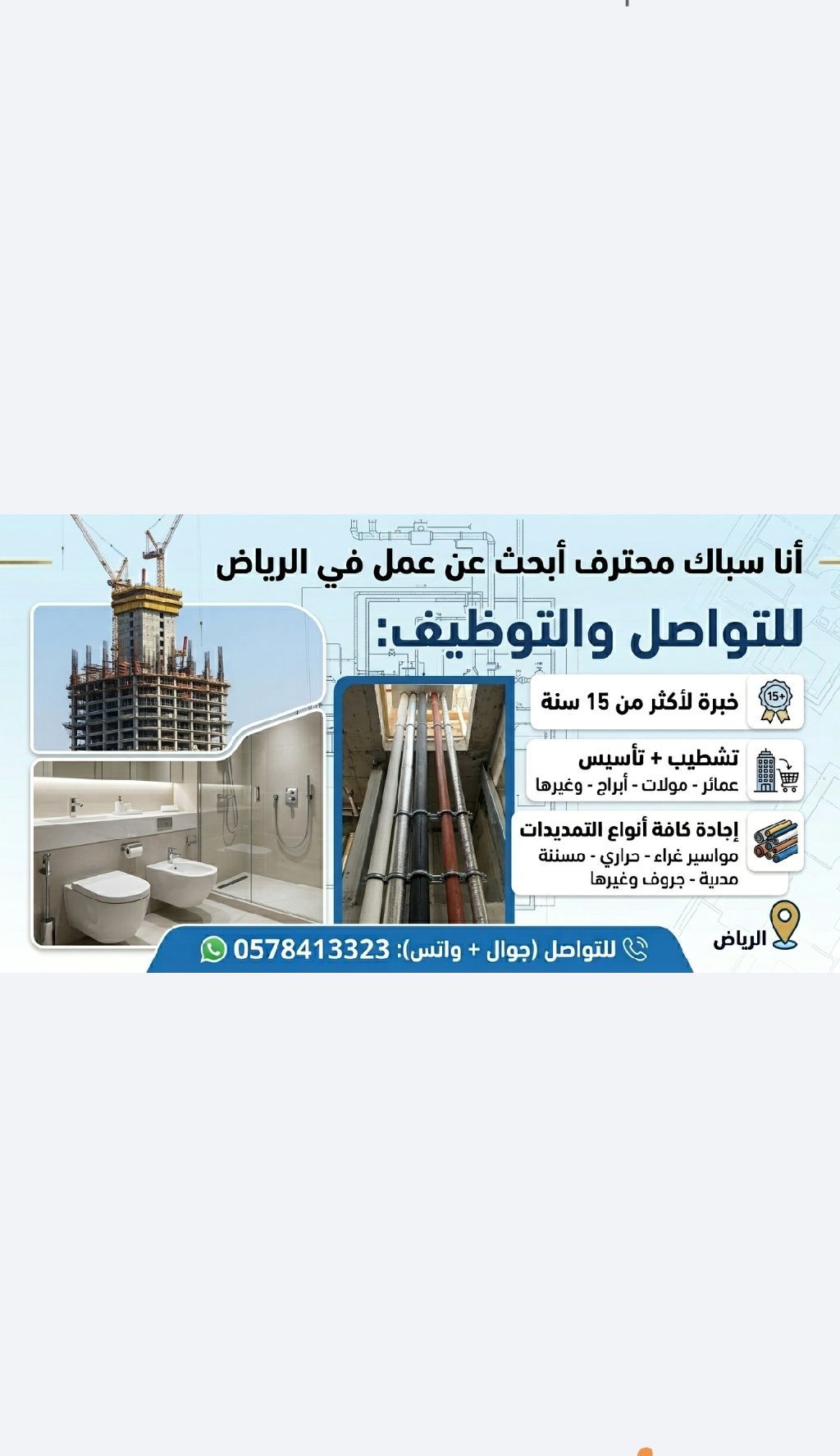 سباك محترف ابحث عن فرصة في الرياض خبرة + 15 سنة تشطيب + تأسيس (عمارات. مولات. أبراج وغيرها) اشتغلت كل أنواع التمديدات (مواسير غراء أو حراري أو مسننة أو جروف وغيرها)