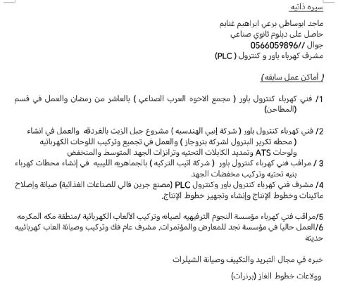 مشرف ومراقب كهرباء كنترول باور PLC في المصانع الغذائية وكهرباء الجهد المتوسط وصيانة وتركيبات ألعاب كهربائية حديثة