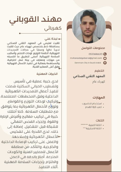 محمد - فني كهرباء دبلوم قوى كهربائية من الكلية التقنية في المدينة المنورة، خبرة في تركيب الأنظمة الكهربائية للمباني السكنية وأنظمة انذار الحريق. متمكن من قراءة المخططات، وسريع التعلم وقابل للتطوير