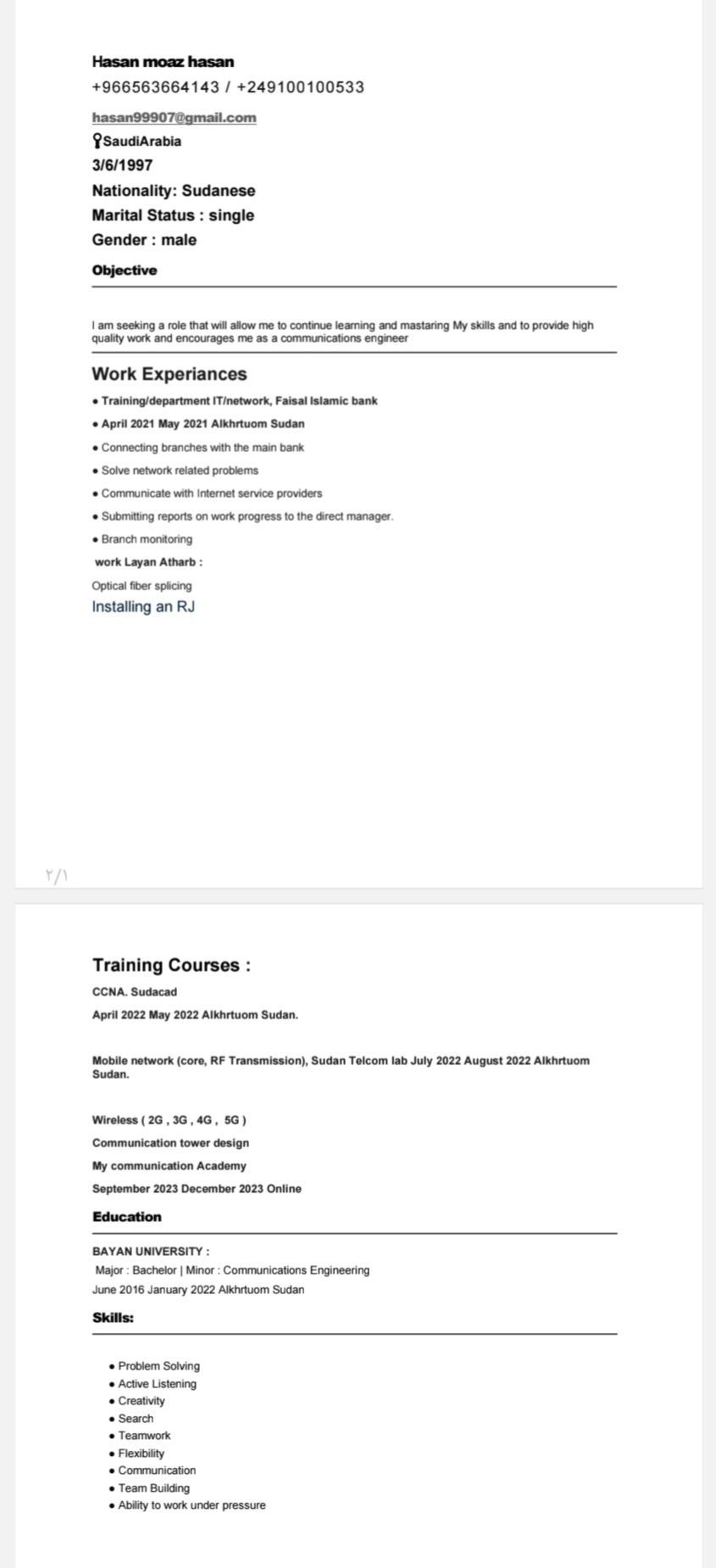 خريج هندسة الاتصالات سوداني مقيم في السعودية لدي رخصة وإقامة 26 سنة ابحث عن فرصة تدريب أو عمل في مجالات الاتصالات أو مدخل بيانات أجيد التعامل مع جهاز لحام الفايبر