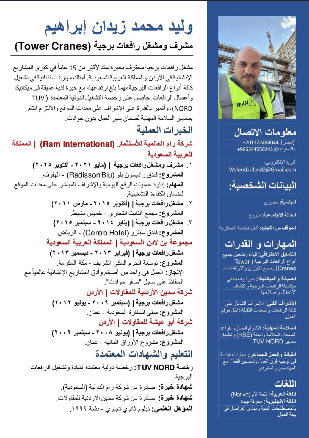 Tower crane supervisor and operator with over 17 years of experience in major projects in Saudi Arabia and Jordan Holds a TUV NORD certified license