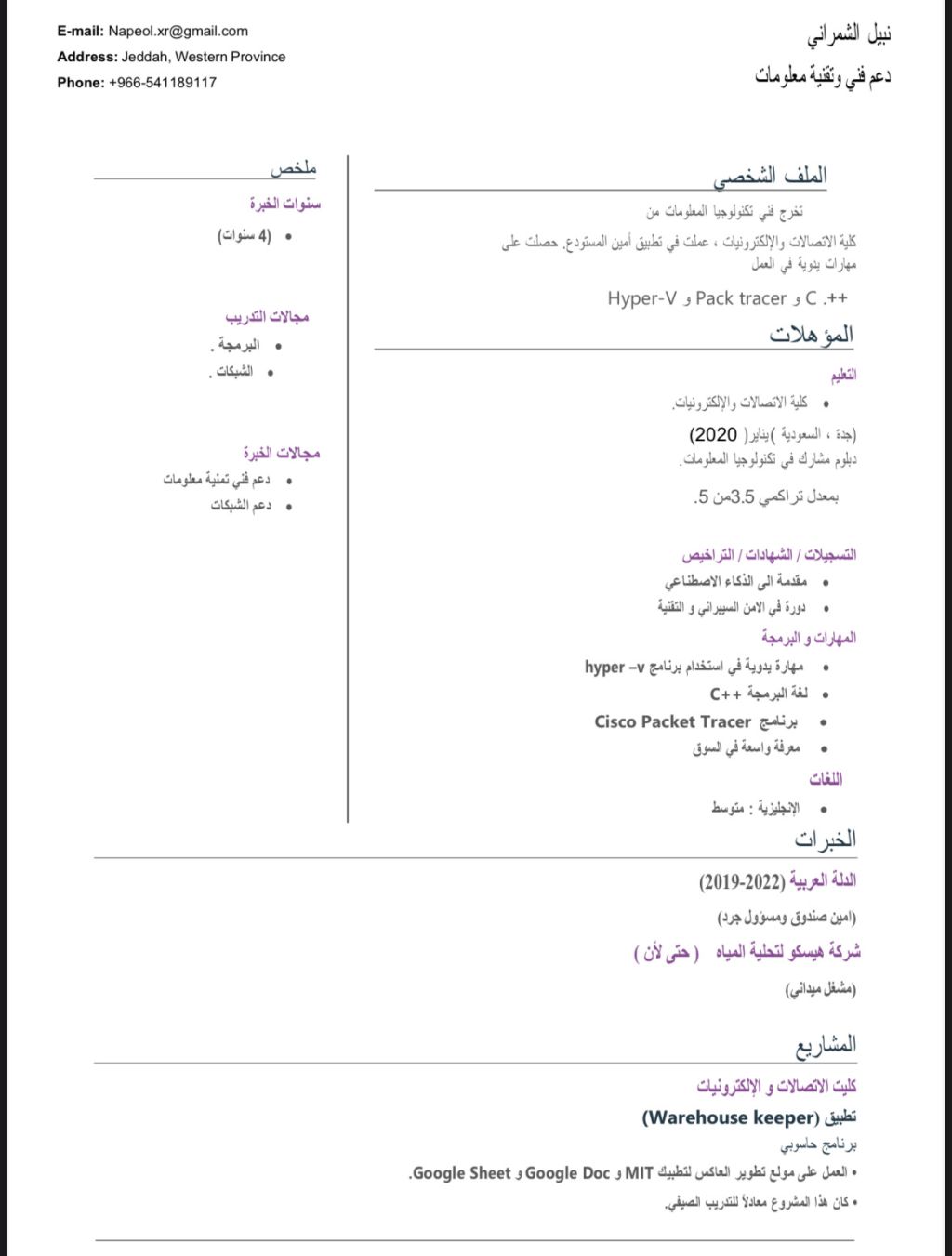 مشغل ميداني - محطة تحلية المياه (HAAISCO) أغسطس 2022م - حتى الآن) حاصل على دبلوم دعم فني لتقنية المعلومات من كلية الاتصالات والالكترونيات - جدة