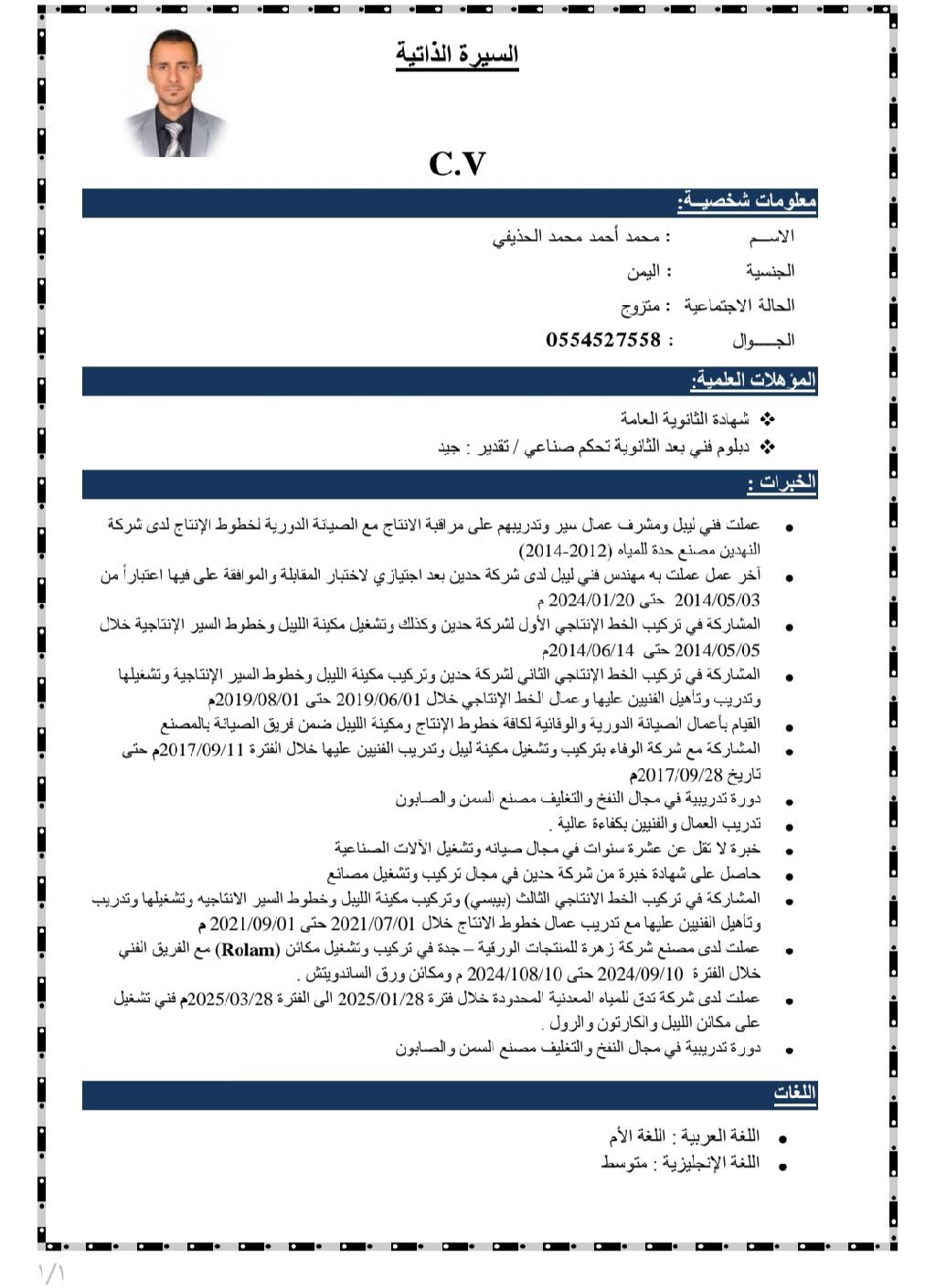 مهندس تركيب وتشغيل وصيانة مصانع مياه ومشروبات القدرة والتكيف على العمل بروح الفريق الواحد والقدرة على العمل تحت ضغط الظروف