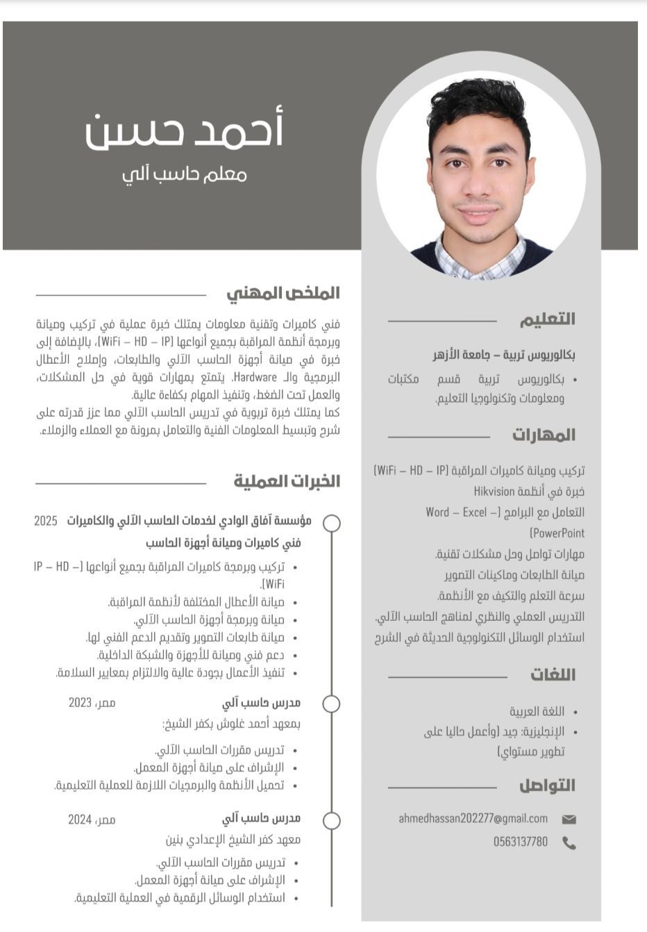 مدرس حاسب الى خبرة سنتين. فني تركيب وصيانة وتأسيس الكاميرات بجميع أنواعها (IP - HD - WiFi) صيانة وبرمجة اجهزة الحاسب الآلي وجميع الأعطال