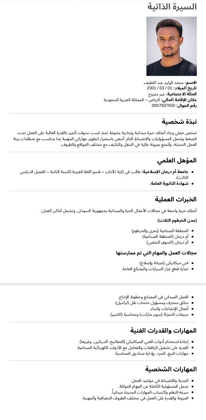 محمد الوليد عبد اللطيف الحالة الجتماعية غير متزوج مكان أإلاقامه الحالي الرياض - المملكة العربية السعودية رقم الجوال نبذة شخصية شخص عملي وجاد امتلك خبرة ميدانية وتجارية متنوعة تمتد لست سنوات أتميز بالقدرة العالية على العمل تحت الضغط
