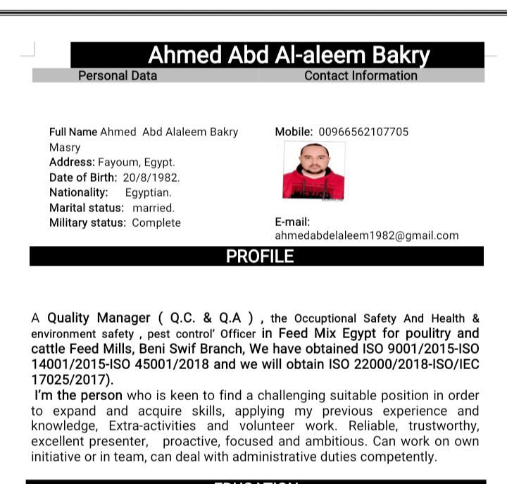ابحث عن عمل. م أحمد متواجد حاليا بالمملكة العربية السعودية ومعي إقامة ومتاح نقل كفالة. خبرة 17 عام في جودة وانتاج الأعلاف والسلامة والصحة المهنية والبيئة ومكافحة الحشرات والقوارض. كنت اعمل حتى شهر ديسمبر السابق كمدير رقابة وتوكيد الجودة والسلامة والصحة المهنية والبيئة ومكافحة الحشرات والقوارض بشركة فيدمكس ايجبت للأعلاف فرع بنى سويف وحصلنا للشركة على بعض شهادات الآيزو. رقم