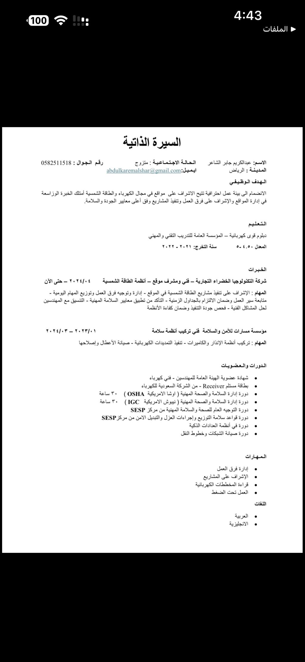 فني كهرباء حاصل على اعتماد هيئة المهندسين يوجد ويوجد لدي اعتماد الشركة السعودية للكهرباء بطاقة مستام وصاحل على دورات في السلامة دوره أوشأ ودوره النيبوش لدي خبرة سنتين في نظام الظاقه الشميسيه مشرف موقع ومشرف سلامه