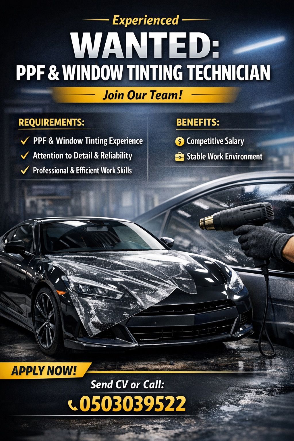 مطلوب فني حماية سيارات وعازل حراري (خبرة) نبحث عن فني حماية PPF وعازل حراري للعمل يشترط توفر خبرة سابقة في حماية (PPF) والعازل الحراري. الدقة في العمل والالتزام بالمواعيد. القدرة على العمل بشكل احترافي وسريع. المميزات راتب مجزي يحدد بعد المقابلة. بيئة عمل مريحة ومستقرة. للتواصل يرجى إرسال السيرة الذاتية أو الاتصال على الرقم الموقع عسير أبها العرين