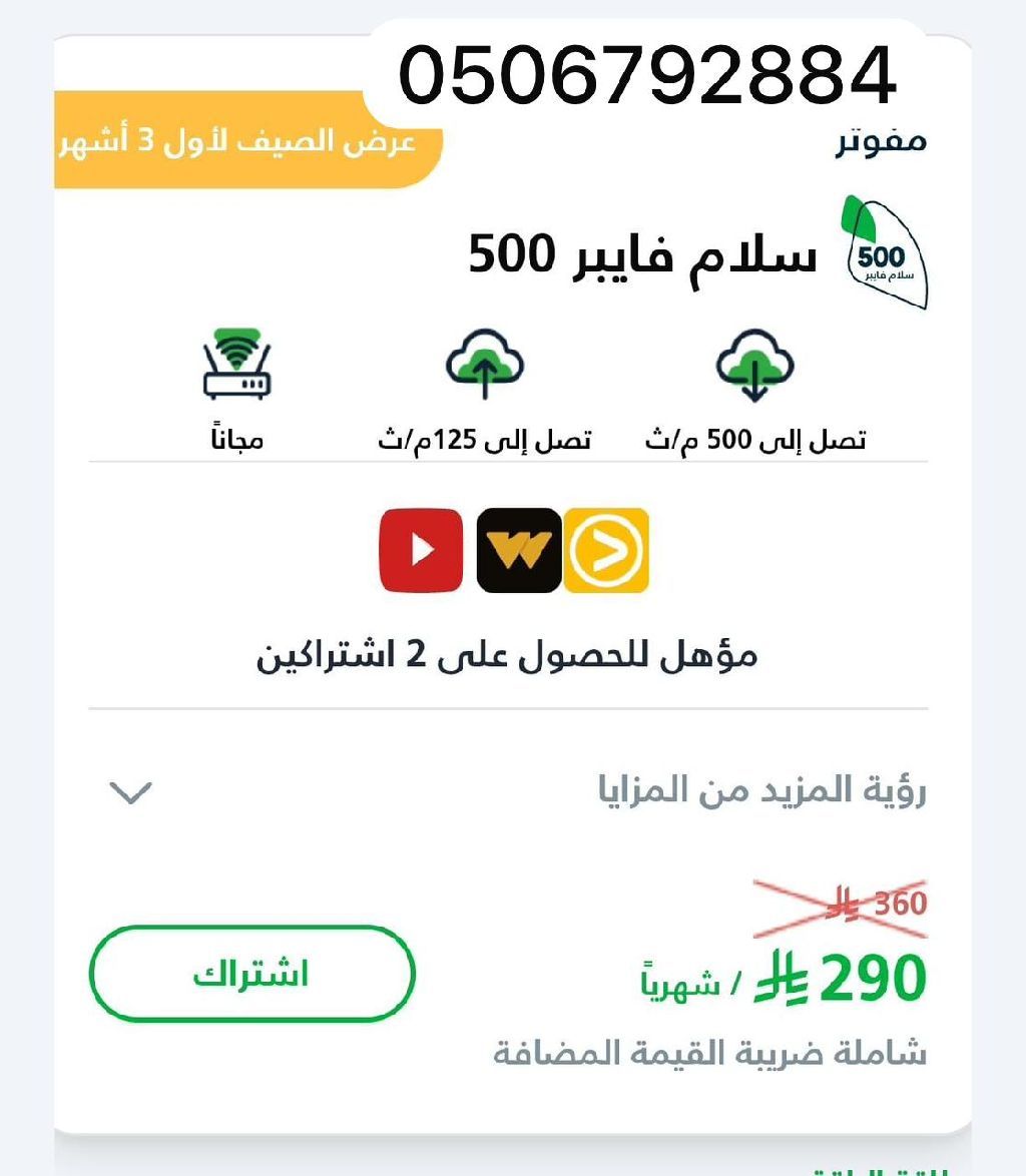 عروض سلام فابير الجديدة 245 لمدة 3 شهور سرعة 300 ميجا بت / ثانيه سرعة الرفع 100 ميجا بت / ثانيه التحميل لا محدود مجانا باقة stc TV lite 5. سعر الباقة 287 ريال فقط شامله الضريبة
