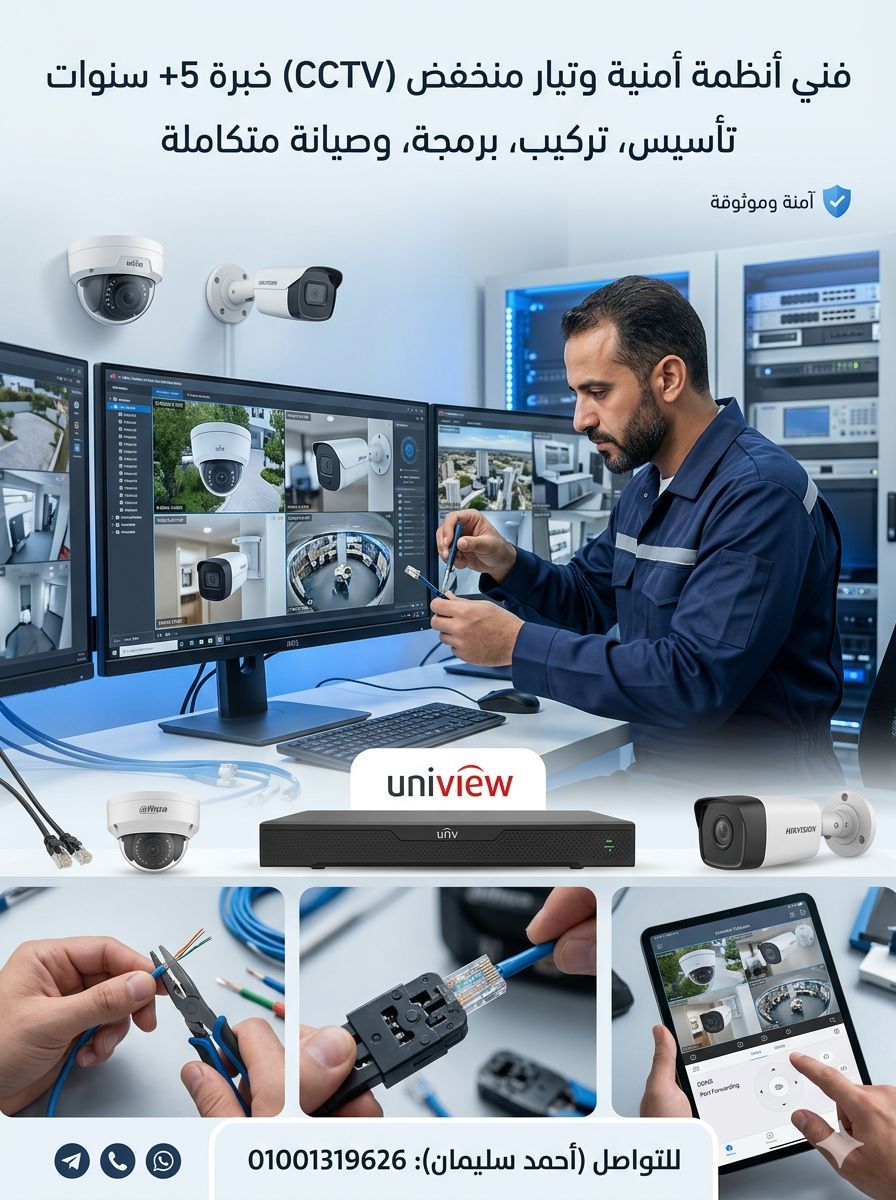 أنا فني متخصص في أنظمة التيار المنخفض وكاميرات المراقبة، بخبرة 5 + سنوات في التركيب والبرمجة كاميرات IP, Analog, Wireless واجهزة التسجيل NVR / DVR وربطها بالجوال واعدادات IP Configuration, DDNS, Port Forwarding خبرة في أنظمة (Hikvision, Dahua, Uniview وتركيب أنظمة أل Intercom وال Access Control والتمديدات والصيانة تمديد كابلات الشبكة (UTP Cat5/ 6 والكابلات المحورية. وصيانة الأعطال، وتحديث